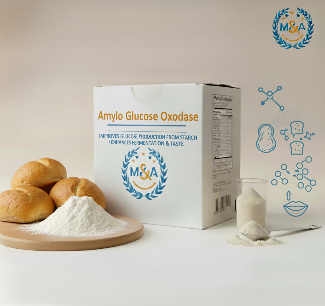 أميلو جلوكوز أوكسيديز يُستخدم في محسنات الدقيق لتحسين إنتاج الجلوكوز من النشا، مما يُحسن من التخمير والطعم.