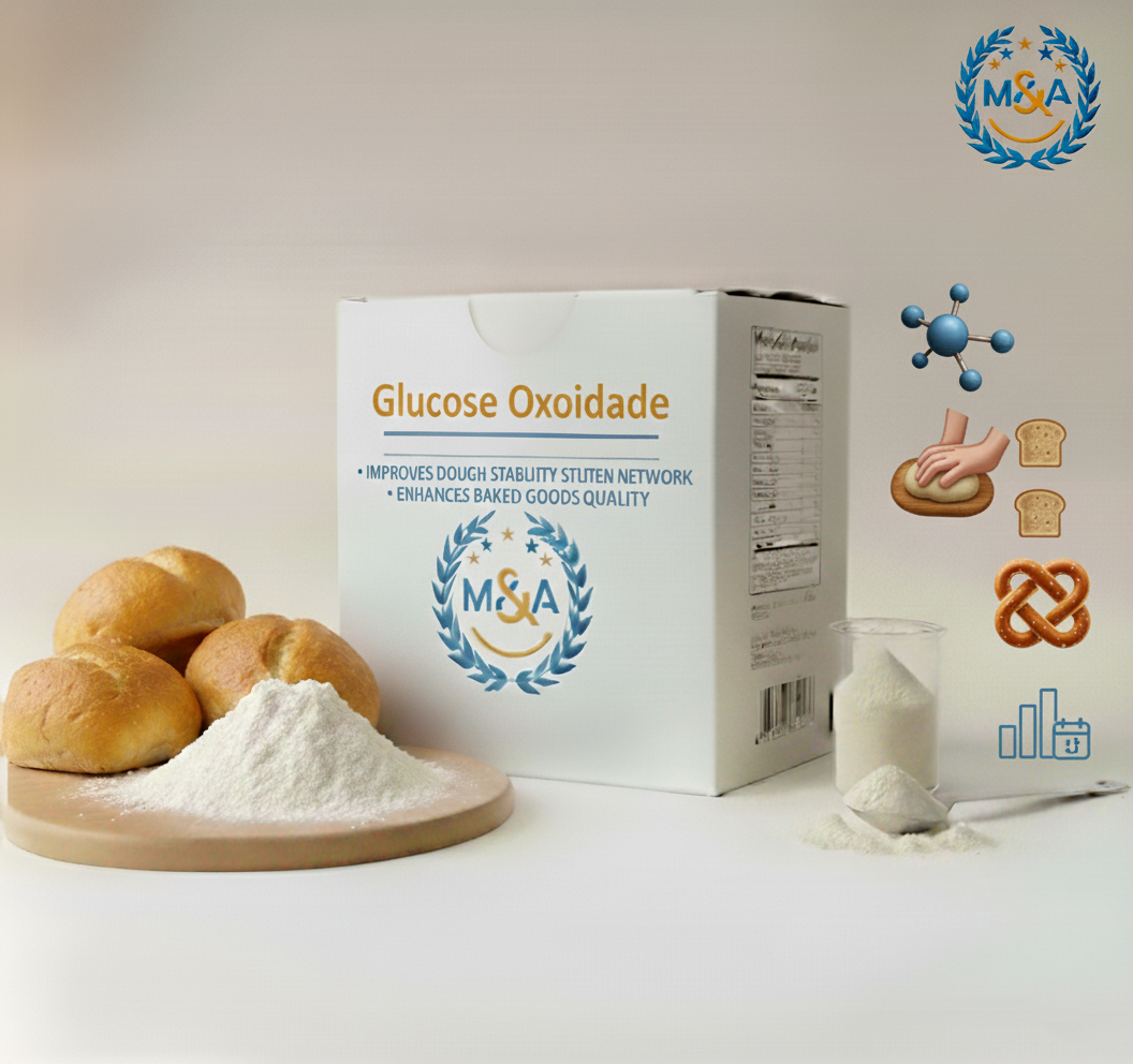 جلوكوز أوكسيديز يُستخدم لتحسين استقرار العجين وتقوية الشبكة الجلوتينية، مما يُحسن من جودة المخبوزات.