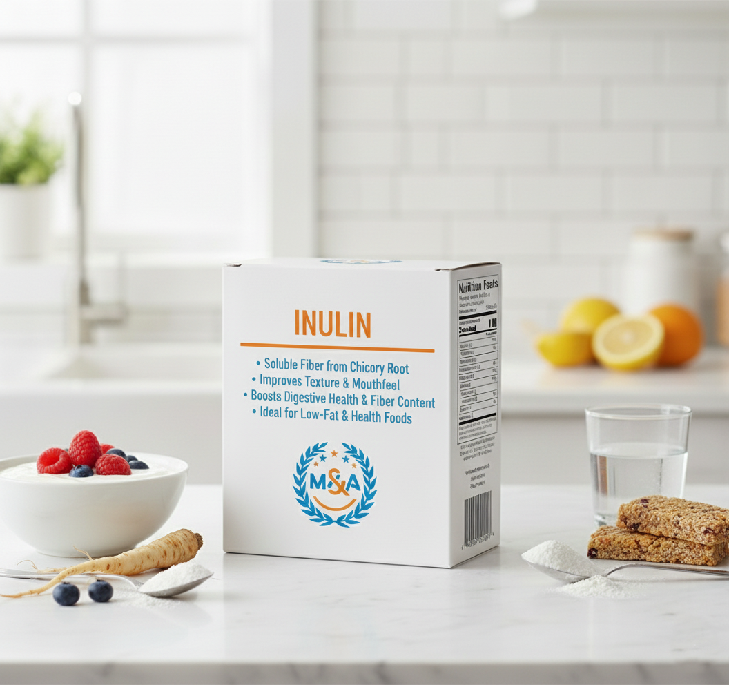 الإينولين ألياف مستخلصة غالبًا من جذور الهندباء (الشِّيكوري)، تُستخدم في الزبادي، مشروبات الألياف، المخبوزات والمنتجات “منخفضة الدسم” لتحسين القوام، رفع محتوى الألياف ودعم صحة الأمعاء، كما تمنح إحساسًا بالفم قريبًا من الدهون مع حلاوة خفيفة، ما يساعد على تطوير منتجات صحية جذابة.