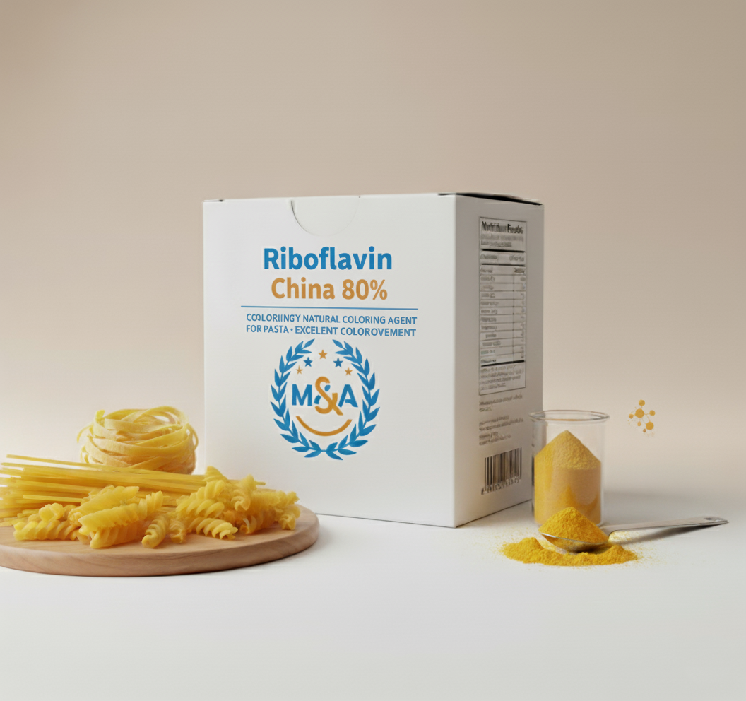 رايبوفلافين صيني بتركيز 80% يُستخدم كمادة ملونة في منتجات المكرونة، ويُعد خيارًا اقتصاديًا لتحسين اللون.