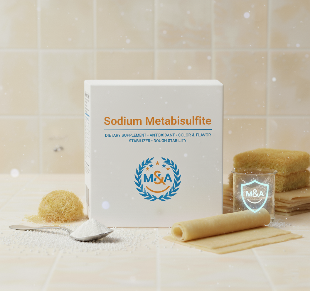 ميتا صوديوم باي سلفيت تُستخدم كمادة مضادة للأكسدة لتحسين استقرار العجين ومنع تغير اللون والطعم أثناء التخزين.
