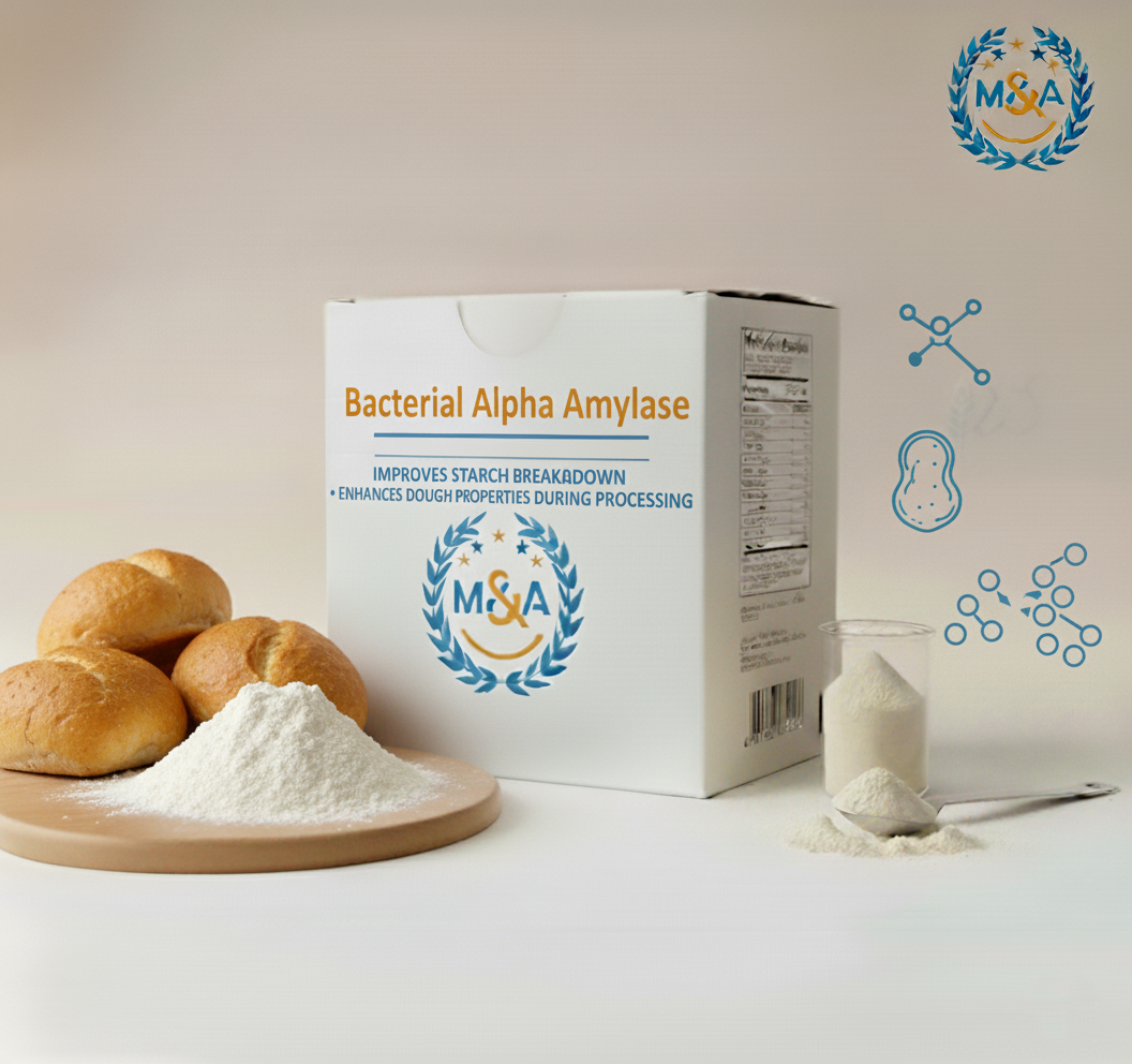 Bacterial alpha amylase is used to improve starch breakdown in flour, contributing to improved dough properties during manufacturing.