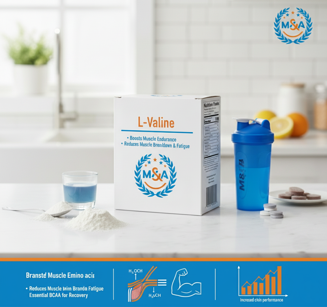 L‑Valine supplies working muscles with extra glucose, helping delay fatigue and protect fibers while supporting protein synthesis and nitrogen balance, particularly as part of a complete BCAA system